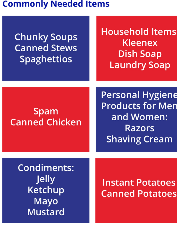 Our pantry relies on the generosity of corporate and individual monetary and food donations to operate. We distribute items such as cereal, pasta, vegetables (both fresh and canned), soups, meats, fruits (fresh and canned), and dairy products. Personal care items for men and women, such as razors, deodorant, shampoo, and conditioner, are also available. We also accept household items such as laundry soap, dish detergent, kleenex, paper towels, and toilet paper.
